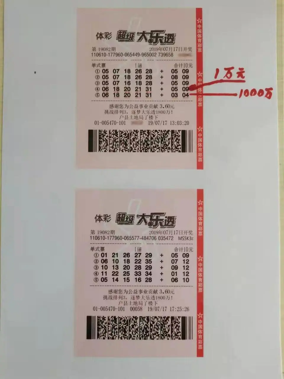兩張彩票其中一張中獎(jiǎng),一組號(hào)碼中獎(jiǎng)1萬(wàn)元,另一組號(hào)碼中獎(jiǎng)1000萬(wàn)元