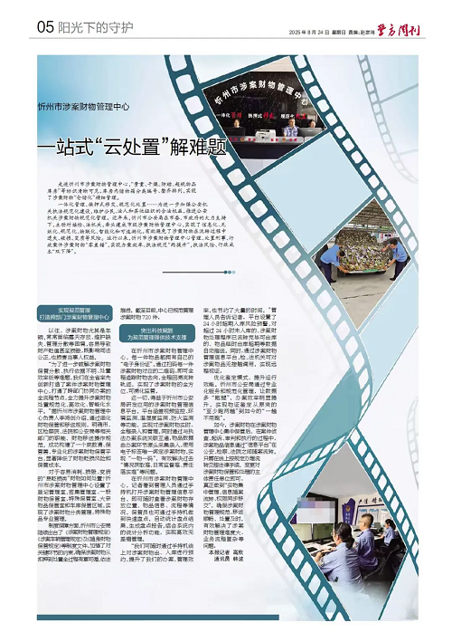 走進(jìn)忻州市涉案財(cái)物管理中心,“貴重、干燥、防磁、超規(guī)物品庫(kù)房”等標(biāo)識(shí)清晰可見,庫(kù)房?jī)?nèi)儲(chǔ)物箱分類編號(hào)、整齊排列,實(shí)現(xiàn)了涉案財(cái)物“倉(cāng)儲(chǔ)化”精細(xì)管理。 一體化管理、換押式移交、規(guī)范化處置……為進(jìn)一步加強(qiáng)公安機(jī)關(guān)執(zhí)法規(guī)范化建設(shè),維護(hù)公民、法人和其他組織的合法權(quán)益,推進(jìn)公安機(jī)關(guān)涉案財(cái)物規(guī)范化管理。近年來(lái),忻州市公安局在市委、市政府的大力支持下,主動(dòng)對(duì)接檢、法機(jī)關(guān),牽頭建成市級(jí)涉案財(cái)物管理中心,實(shí)現(xiàn)了信息化、無(wú)紙化、規(guī)范化、物聯(lián)化、智能化和可追溯化,有效避免了涉案財(cái)物在流轉(zhuǎn)過(guò)程中遺失、破損、變質(zhì)等風(fēng)險(xiǎn)。運(yùn)行以來(lái),忻州市涉案財(cái)物管理中心管理、處置刑事、行政案件涉案財(cái)物“零差錯(cuò)”,實(shí)現(xiàn)辦案效率、執(zhí)法規(guī)范“兩提升”,執(zhí)法風(fēng)險(xiǎn)、行政成本“雙下降”。 實(shí)現(xiàn)規(guī)范管理 打造跨部門涉案財(cái)物管理中心 以往,涉案財(cái)物尤其是車輛,常常面臨露天存放、維護(hù)缺失、管理分散等困境,容易導(dǎo)致財(cái)產(chǎn)貶值甚至損毀,既影響司法公正,也損害當(dāng)事人權(quán)益。 “為了進(jìn)一步破解涉案財(cái)物保管分散、執(zhí)行依據(jù)不明、處置效率低等難題,我們?cè)谌÷氏葎?chuàng)新打造了案件涉案財(cái)物管理中心,打通了跨部門協(xié)同辦案的全流程節(jié)點(diǎn),全力提升涉案財(cái)物處置規(guī)范化、高效化、智能化水平?!睋?jù)忻州市涉案財(cái)物管理中心負(fù)責(zé)人李鴻劍介紹,通過(guò)細(xì)化財(cái)物保管和移送規(guī)則,明確市、區(qū)檢察院、法院和公安局等相關(guān)部門的職能、財(cái)物移送操作規(guī)范,成功構(gòu)建了一個(gè)底數(shù)清、保管善、專業(yè)化的涉案財(cái)物保管平臺(tái),顯著降低了財(cái)物貶損風(fēng)險(xiǎn)和保管成本。 對(duì)于容易消耗、損毀、變質(zhì)的“易貶損類”財(cái)物如何處置?忻州市涉案財(cái)物管理中心設(shè)置了登記管理室、密集管理室、一般財(cái)物保管室、特殊保管室、大宗物品保管室和車庫(kù)保管區(qū)域,實(shí)現(xiàn)了涉案財(cái)物分類管理,特殊物品專業(yè)管理。 制度保障方面,忻州市公安局陸續(xù)出臺(tái)了《涉案財(cái)物管理規(guī)定》《涉案車輛管理規(guī)定》及《隨身財(cái)物保管規(guī)定》等制度文件,加強(qiáng)了對(duì)關(guān)鍵環(huán)節(jié)的約束,確保涉案財(cái)物從扣押到處置全過(guò)程有章可循、依法推進(jìn)。截至目前,中心已規(guī)范管理涉案財(cái)物720件。 突出科技賦能 為規(guī)范管理提供技術(shù)支撐 在忻州市涉案財(cái)物管理中心,每一件物品都擁有自己的“電子身份證”。通過(guò)掃碼每一件涉案財(cái)物對(duì)應(yīng)的二維碼,即可全程追蹤財(cái)物去向,全程回溯流轉(zhuǎn)軌跡,實(shí)現(xiàn)了涉案財(cái)物的全方位、可溯化監(jiān)管。 這一切,得益于忻州市公安局研發(fā)應(yīng)用的涉案財(cái)物管理信息平臺(tái)。平臺(tái)涵蓋視頻監(jiān)控、環(huán)境監(jiān)測(cè)、溫濕度監(jiān)測(cè)、防火監(jiān)測(cè)等功能,實(shí)現(xiàn)對(duì)涉案財(cái)物實(shí)時(shí)、全程錄入和管理。同時(shí)通過(guò)與執(zhí)法辦案系統(tǒng)關(guān)聯(lián)互通,物品數(shù)據(jù)由辦案環(huán)節(jié)源頭采集錄入,使用電子標(biāo)簽唯一綁定涉案財(cái)物,實(shí)現(xiàn)“一物一碼”,有效解決過(guò)去“情況獲取難、日常監(jiān)督難、責(zé)任落實(shí)難”等問(wèn)題。 在忻州市涉案財(cái)物管理中心,記者看到管理人員通過(guò)手持機(jī)打開涉案財(cái)物管理信息平臺(tái),即可隨時(shí)查看涉案財(cái)物存放位置、物品信息、流程等情況,保管員也可通過(guò)手持機(jī)做到快速盤點(diǎn),自動(dòng)統(tǒng)計(jì)盤點(diǎn)結(jié)果,生成盤點(diǎn)報(bào)告,結(jié)合系統(tǒng)內(nèi)的統(tǒng)計(jì)分析功能,實(shí)現(xiàn)高效無(wú)差錯(cuò)管理。 “我們可隨時(shí)通過(guò)手持機(jī)線上對(duì)涉案財(cái)物出、入庫(kù)進(jìn)行預(yù)約,提升了我們的辦案、管理效率,也節(jié)約了大量的時(shí)間?!惫芾砣藛T告訴記者,平臺(tái)設(shè)置了24小時(shí)超期入庫(kù)風(fēng)險(xiǎn)預(yù)警,對(duì)超過(guò)24小時(shí)未入庫(kù)的、涉案財(cái)物處理程序已流轉(zhuǎn)完畢可出庫(kù)的、物品臨時(shí)出庫(kù)超期等數(shù)據(jù)自動(dòng)推送。同時(shí),通過(guò)涉案財(cái)物管理信息平臺(tái),檢、法機(jī)關(guān)可對(duì)涉案物品無(wú)接觸調(diào)用,實(shí)現(xiàn)遠(yuǎn)程視證。 優(yōu)化鑒定模式、提升運(yùn)行效能。忻州市公安局通過(guò)專業(yè)化服務(wù)和規(guī)范化管理,讓數(shù)據(jù)多“跑腿”,辦案效率明顯提升,實(shí)現(xiàn)物證鑒定從原來(lái)的“至少跑兩趟”到如今的“一趟不用跑”。 如今,涉案財(cái)物在涉案財(cái)物管理中心集中保管后,在案件偵查、起訴、審判和執(zhí)行的過(guò)程中,涉案物