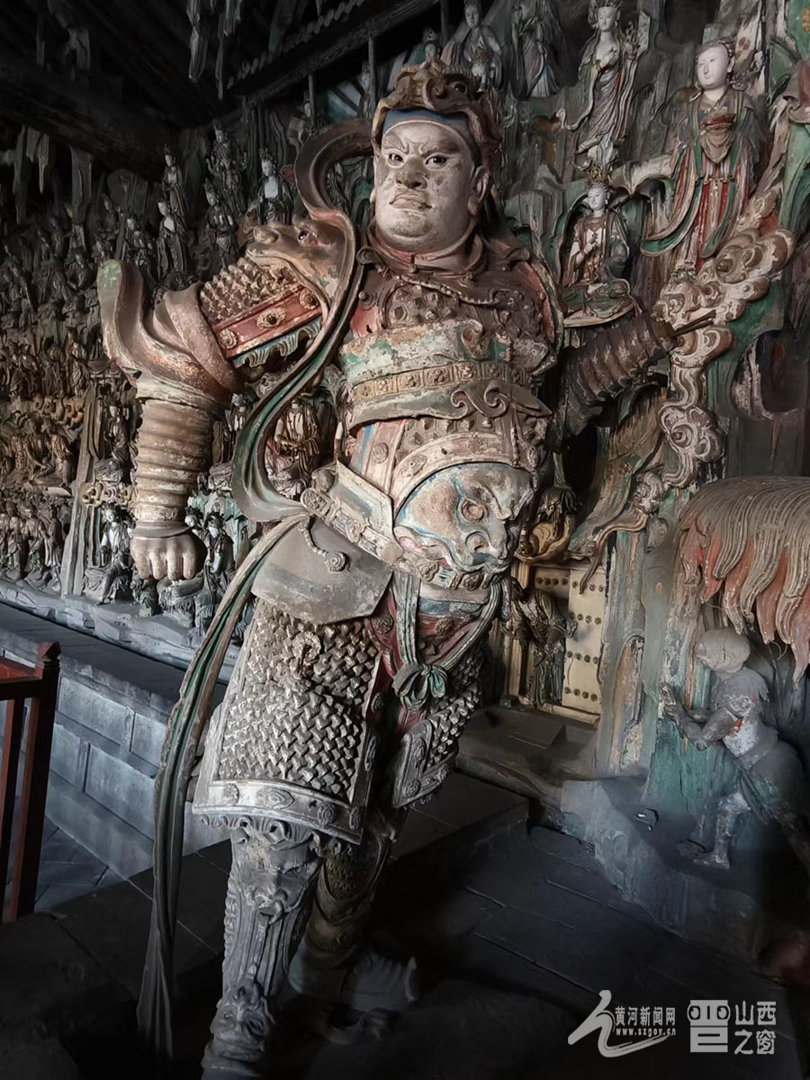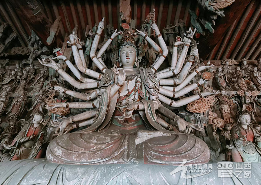 寺內(nèi)擁有總計(jì)2000多尊彩塑,大者丈余、小者尺許,每一壁龕為一獨(dú)立神話或佛教故事,人物造型生動,神態(tài)逼真,尤其以“千手觀音像”與“韋馱像”最為經(jīng)典。舞蹈《千手觀音》的靈感原型就是這尊千手觀音像。塑像高達(dá)數(shù)米,全身貼金,背后伸出上千只手臂,每只手掌上都有一只眼睛,錯落有致,整個造像氣勢恢宏,達(dá)到雕塑藝術(shù)中和諧、完美的境界。韋馱像巍然肅立,身披甲胄,神情凝重,整個身體呈現(xiàn)出一種微妙的動態(tài)平衡,是明代彩塑中少見的藝術(shù)杰作,被譽(yù)為“天下第一韋馱”“全國韋馱之冠”。景區(qū)講解員侯麗娟介紹:“這尊塑像的高明之處就在于匠師不落俗套,打破了一般程式的限制,賦予了韋馱一種時間的節(jié)奏性和動作的連續(xù)性,產(chǎn)生了雕塑作品的最高境界‘不動之動’?!?/p>