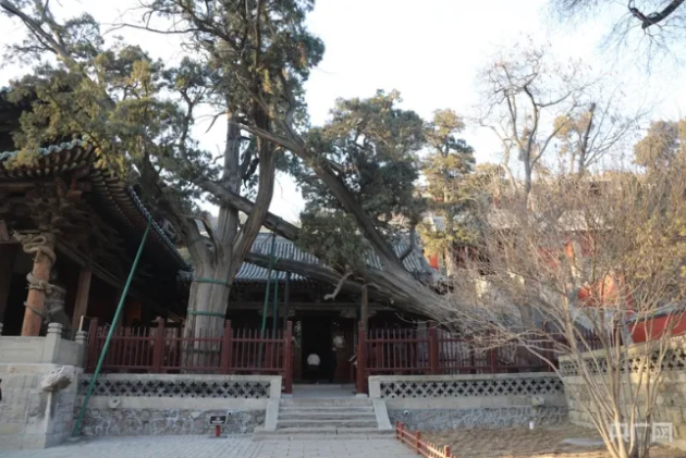 三千年晉祠的“見證者”——周柏。周柏長于圣母殿右側(cè),18米長的周柏向南傾斜生長,被另一株古柏所支撐,樹葉披覆在圣母殿頂,樹干粗壯,得幾人才能合抱,像一條橫臥的巨龍,因此有“臥龍柏”之美譽(yù)。經(jīng)科學(xué)測定,此樹已有二千九百九十多歲。在晉祠,樹齡在千年以上的蒼松、翠柏、古槐等尚存二十余株,它們和古柏一起見證著晉祠的悠悠歷史。