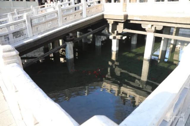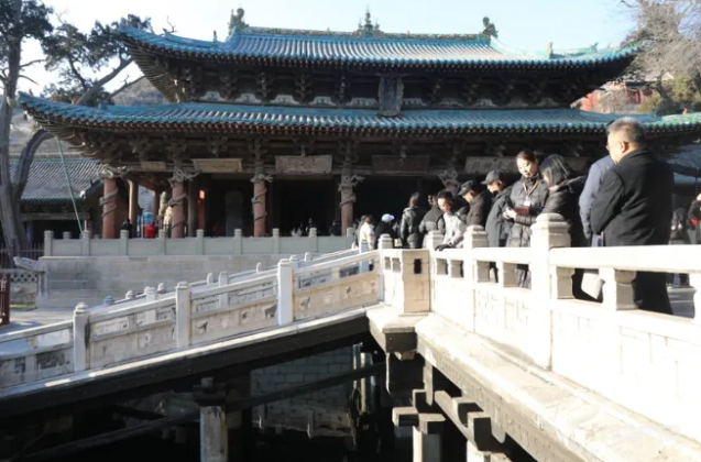 中國最早的水陸立交橋——魚沼飛梁。魚沼飛梁西依圣母殿,東鄰獻(xiàn)殿,初建在北魏之前。飛梁的形式古樸,橫跨于魚沼之上,借以觀賞景物,南北東西四面伸長,如鳥之振翼欲飛狀,是中國少有的一種十字橋梁形式,被譽(yù)為中國最早的水陸立交橋。