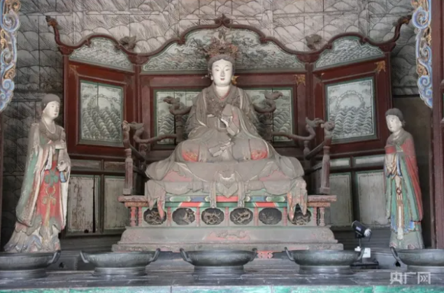 外觀玲瓏似涼亭——獻(xiàn)殿。獻(xiàn)殿是給圣母殿邑姜供奉祭品的享堂,始建于金大定八年(1168),明萬歷二十二年(1594)重修。獻(xiàn)殿高9.75米,其梁架節(jié)省材料且堅(jiān)固,斗拱結(jié)構(gòu)疏朗,外觀玲瓏似涼亭。