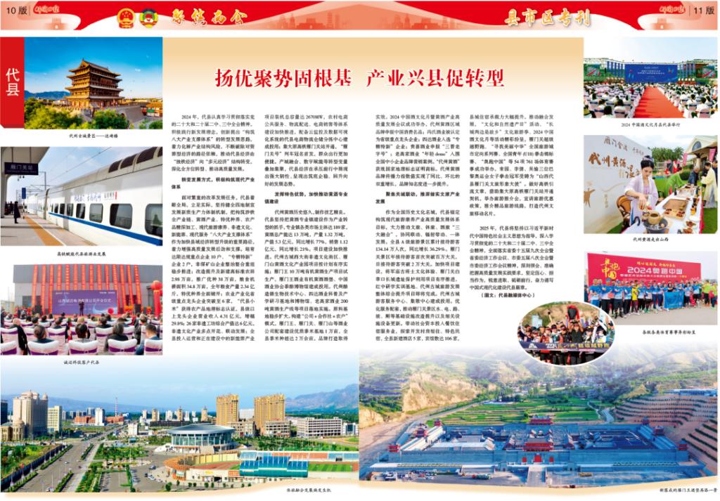 轉(zhuǎn)變發(fā)展方式,積極構(gòu)筑現(xiàn)代產(chǎn)業(yè)體系面對繁重的改革發(fā)展任務(wù),代縣著眼全局,立足實際,堅持健全因地制宜發(fā)展新質(zhì)生產(chǎn)力體制機制,把構(gòu)筑涉鐵全產(chǎn)業(yè)鏈、黃酒產(chǎn)業(yè)、特優(yōu)種養(yǎng)、農(nóng)產(chǎn)品精深加工、現(xiàn)代旅游康養(yǎng)、非遺文化、新能源、現(xiàn)代服務(wù)“八大產(chǎn)業(yè)支撐體系”作為加快縣域經(jīng)濟轉(zhuǎn)型升級的重要路徑,著力增強高質(zhì)量發(fā)展后勁和支撐。培育達限達規(guī)重點企業(yè)10戶、“專精特新”企業(yè)2戶,非煤礦山企業(yè)整治整合重組穩(wěn)步推進;改造提升及新建高標準農(nóng)田2.98萬畝,推廣優(yōu)種38萬畝,糧食機耕面積34.8萬畝,全年糧食產(chǎn)量2.34億斤,特優(yōu)種養(yǎng)全面鋪開;農(nóng)業(yè)產(chǎn)業(yè)化省級重點龍頭企業(yè)突破至6家,“代縣小米”獲得農(nóng)產(chǎn)品地理標志認證,縣級以上龍頭企業(yè)營業(yè)收入4.31億元,增幅29.8%;26家非遺工坊綜合產(chǎn)值達6億元,非遺文化產(chǎn)業(yè)多點開花、聯(lián)動發(fā)展;全縣投入運營和正在建設(shè)中的新能源產(chǎn)業(yè)項目裝機總?cè)萘窟_2670MW,農(nóng)村電商公共服務(wù)、物流配送、電商銷售等體系建設(shè)加快推進,配備云監(jiān)控及數(shù)據(jù)可視化系統(tǒng)的代縣電商物流倉儲分揀中心建成投用;集大原高鐵雁門關(guān)站開通,“雁門關(guān)號”列車冠名首發(fā),群眾出行更加便捷。產(chǎn)城融合、數(shù)字賦能等轉(zhuǎn)型變量疊加集聚,代縣經(jīng)濟在承壓前行中展現(xiàn)出強大韌性,呈現(xiàn)出筑底企穩(wěn)、回升向好的發(fā)展態(tài)勢。