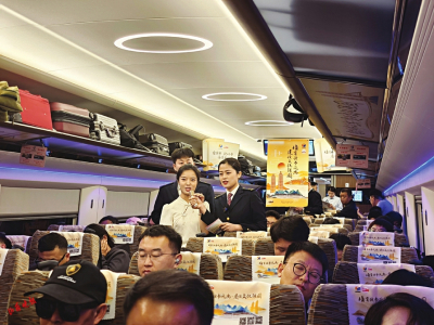 4月22日一早,在太原開往北京的書香列車上,山西晚報記者看到了這樣一幕。車廂內(nèi),兩側(cè)車窗、行李架、衛(wèi)生間、洗漱臺等處張貼全民閱讀大會標(biāo)識,營造了濃厚的活動氛圍。列車視頻和廣播循環(huán)播放全民閱讀大會宣傳片,介紹大會概況及“書香列車”情況。幾名年輕乘客圍在列車餐吧臺增設(shè)的“讀書角”,選取自己喜歡的讀物。列車工作人員利用流動小車,送書到車廂,為旅客提供圖書借閱服務(wù)。在車廂兩端、每個座位頭枕巾上張貼、印刷全民閱讀大會主題海報和“書香列車云閱讀”二維碼,不少旅客掃碼開始免費聽書、看書。