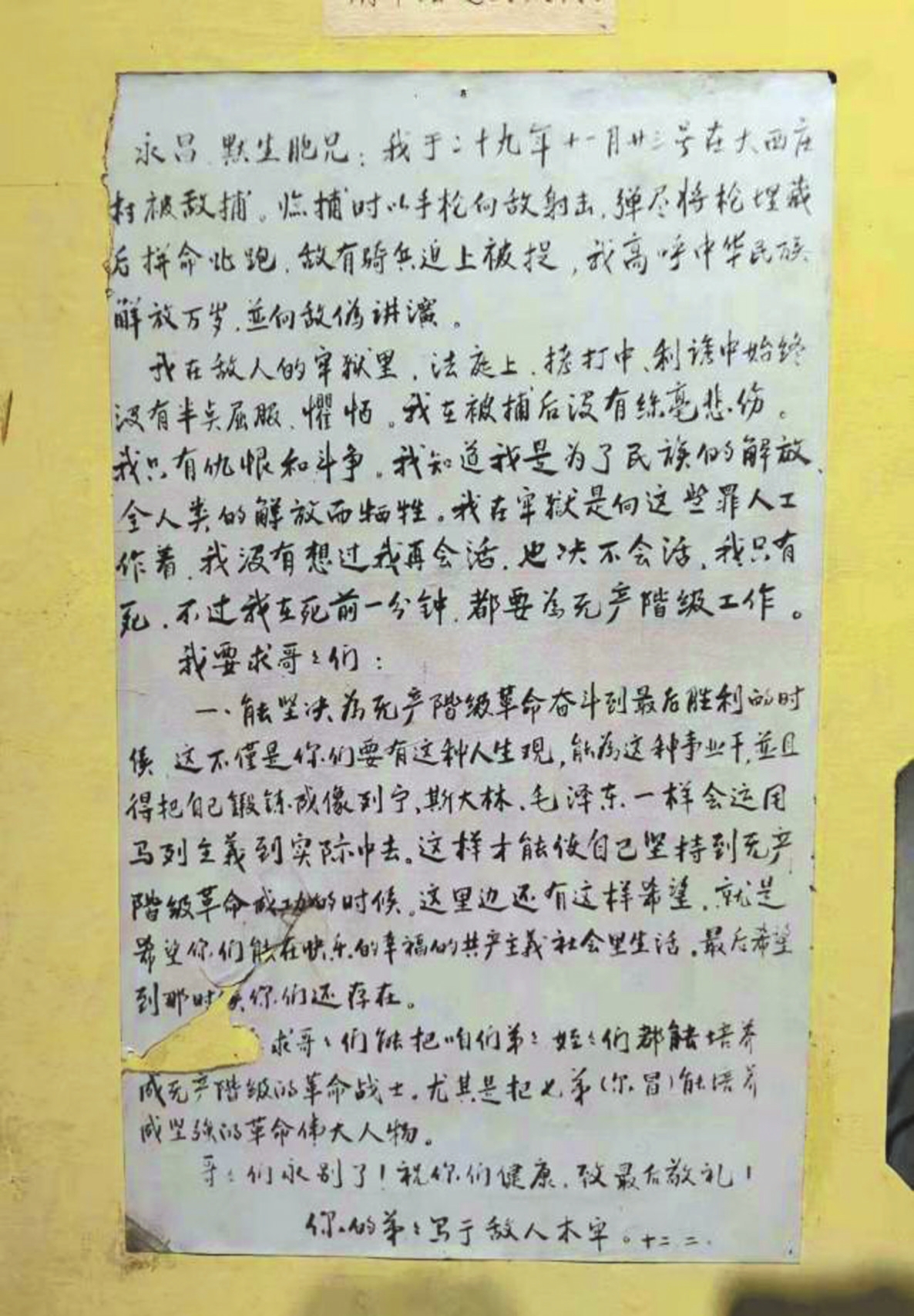 遺書中,表達了對抗戰(zhàn)勝利的必勝信心;直言“我死了是為國家為民族而犧牲”,以生命詮釋對黨的忠誠,展現(xiàn)了共產(chǎn)黨人堅貞不屈的崇高革命精神與為共產(chǎn)主義奮斗終身的犧牲精神。