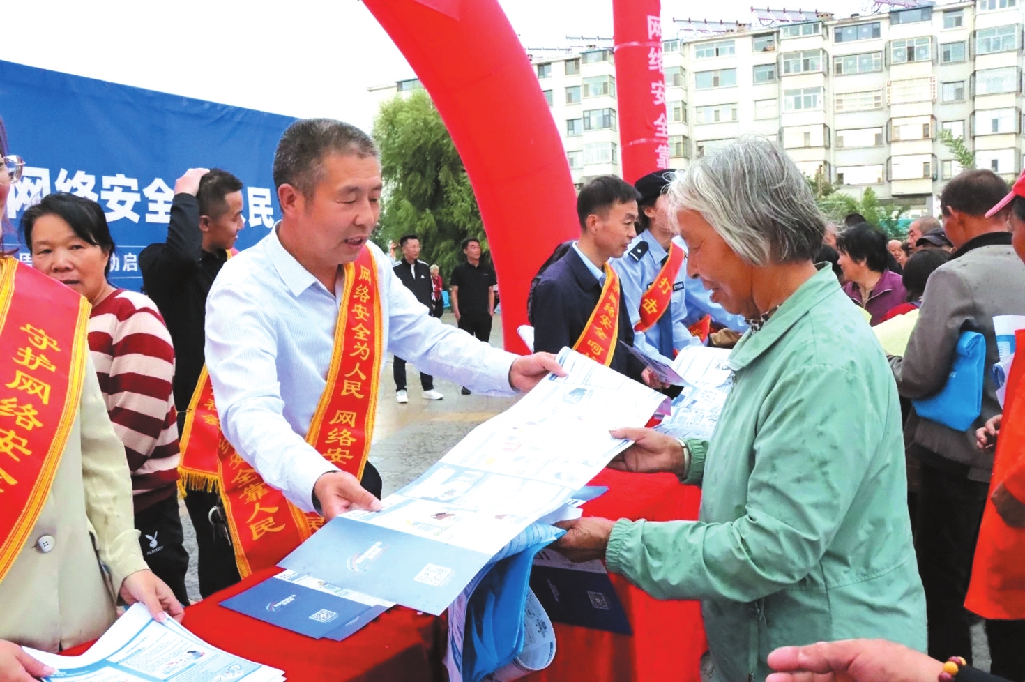 圖為工作人員正在發(fā)放網(wǎng)絡安全宣傳資料。