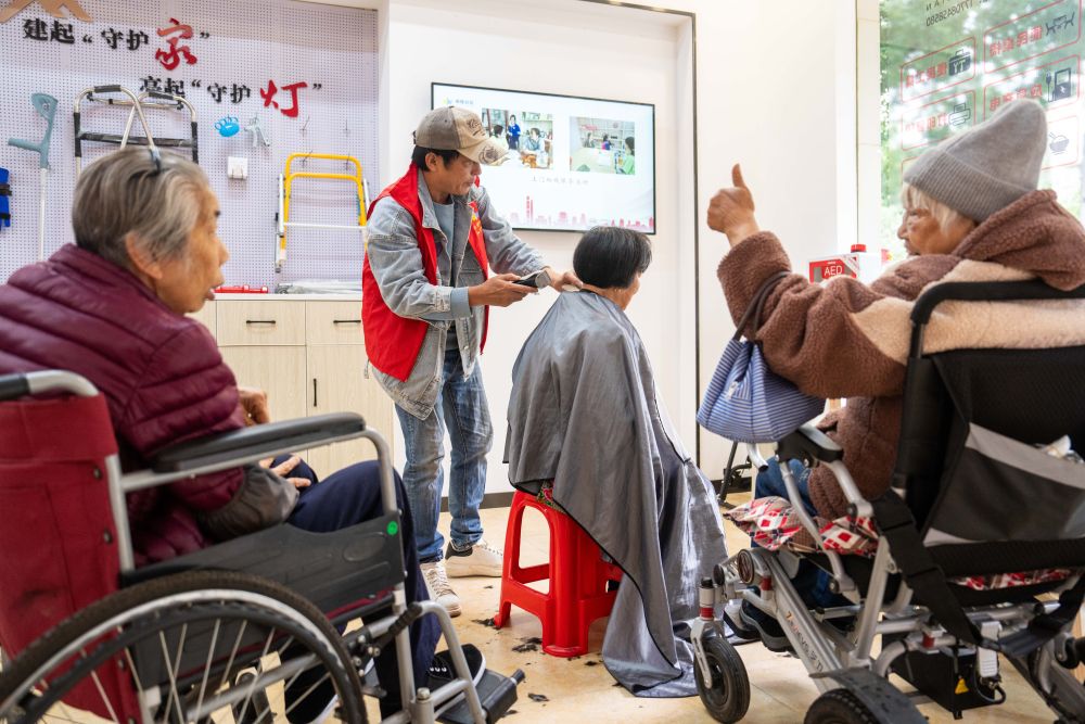 2025年11月6日,在湖南省長沙市望城區(qū)高塘嶺街道湘陵社區(qū),志愿者為老年人和殘疾人士免費理發(fā)。新華社記者 陳思汗 攝