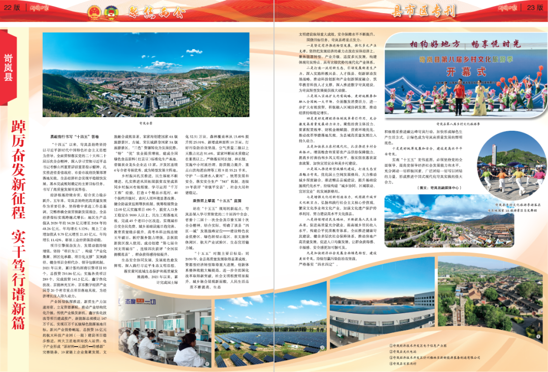 踔厲奮發(fā)新征程 實干篤行譜新篇 勇毅前行書寫“十四五”答卷 “十四五”以來,岢嵐縣始終堅持以習(xí)近平新時代中國特色社會主義思想為指導(dǎo),全面貫徹落實黨的二十大和二十屆歷次全會精神,深入學(xué)習(xí)貫徹習(xí)近平總書記考察山西重要講話重要指示精神,扎實推進省委省政府、市委市政府決策部署落地見效,全縣經(jīng)濟社會實現(xiàn)平穩(wěn)較快發(fā)展,基本完成規(guī)劃確定的主要目標(biāo)任務(wù),書寫了高質(zhì)量發(fā)展岢嵐答卷。 經(jīng)濟根基持續(xù)夯實,綜合實力穩(wěn)步躍升。五年來,岢嵐縣始終把高質(zhì)量發(fā)展作為首要任務(wù),堅持穩(wěn)中求進工作總基調(diào),完整準(zhǔn)確全面貫徹新發(fā)展理念,全縣經(jīng)濟指標(biāo)實現(xiàn)跨越式增長:地區(qū)生產(chǎn)總值從2020年的34.28億元增至2024年的48.26億元,年均增長5.12%;規(guī)上工業(yè)增加值從9.79億元增至21.83億元,年均增長11.42%,彰顯工業(yè)經(jīng)濟強勁動能。 項目引擎強勁發(fā)力,發(fā)展動能持續(xù)增強。堅持“項目為王”,構(gòu)建“產(chǎn)業(yè)化集聚、園區(qū)化承載、項目化支撐”發(fā)展路徑,健全項目全程代辦、領(lǐng)導(dǎo)包聯(lián)機制。2021年以來,累計簽約招商引資項目93個,總投資210.86億元;實施各類項目280個,完成投資141.2億元。鑫宇焦化技改、京能林光互補、京東數(shù)字經(jīng)濟產(chǎn)業(yè)園等20個省市重點項目落地見效,為經(jīng)濟增長注入持久動力。 產(chǎn)業(yè)轉(zhuǎn)型縱深推進,新質(zhì)生產(chǎn)力加速培育。立足資源稟賦,推動產(chǎn)業(yè)結(jié)構(gòu)優(yōu)化升級。傳統(tǒng)產(chǎn)業(yè)煥發(fā)新機,鑫宇焦化技改等項目建成投產(chǎn),新能源總規(guī)模達147萬千瓦,實現(xiàn)百萬千瓦級綠色能源基地目標(biāo)。新興產(chǎn)業(yè)強勢崛起,總投資16億元的航天科技產(chǎn)業(yè)園(一期)建設(shè)項目穩(wěn)步推進,兩大衛(wèi)星地面站投入運營;電子產(chǎn)業(yè)形成“原材料—元器件—傳感器”完整鏈條,10家鏈上企業(yè)集聚發(fā)展。文旅融合成效顯著,宋家溝創(chuàng)建國家4A級旅游景區(qū),古城、宋長城躋身國家3A級旅游景區(qū),“三色”資源轉(zhuǎn)化為發(fā)展優(yōu)勢?!疤亍薄皟?yōu)”農(nóng)業(yè)提質(zhì)增效,建成全國綠色食品原料(紅蕓豆)標(biāo)準(zhǔn)化生產(chǎn)基地,省級農(nóng)業(yè)龍頭企業(yè)達12家。開發(fā)區(qū)連續(xù)4年全省考核優(yōu)秀,成為轉(zhuǎn)型發(fā)展主陣地。 鄉(xiāng)村振興扎實推進,民生福祉不斷增進。扎實推進鞏固拓展脫貧攻堅成果同鄉(xiāng)村振興有效銜接,學(xué)習(xí)運用“千萬工程”經(jīng)驗,打造4個精品示范村、40個提檔升級村,農(nóng)村人居環(huán)境顯著改善。健全防返貧監(jiān)測幫扶機制,統(tǒng)籌銜接資金12.09億元實施項目490個,脫貧人口務(wù)工穩(wěn)定在9000人以上。民生工程落地見效,完成45個老舊小區(qū)改造,實現(xiàn)城市公交全民免費,城鄉(xiāng)基礎(chǔ)設(shè)施日趨完善。教育質(zhì)量穩(wěn)步提升,高考本科達線連續(xù)五年破百。醫(yī)療服務(wù)能力增強,縣醫(yī)院新院區(qū)投入使用。成功創(chuàng)建“第七屆全國文明城市”,連續(xù)四次獲評“全國雙擁模范縣”,群眾獲得感持續(xù)提升。 生態(tài)安全協(xié)同發(fā)展,發(fā)展底色愈發(fā)鮮明。深入踐行習(xí)近平生態(tài)文明思想,落實黃河流域生態(tài)保護和高質(zhì)量發(fā)展戰(zhàn)略,2021年以來,累計完成國土綠化52.51萬畝,森林覆蓋率從15.49%提升到25.01%,新增成林面積10萬畝。打好污染防治攻堅戰(zhàn),空氣質(zhì)量二級以上天數(shù)占比達91.6%,雷家坪斷面水質(zhì)穩(wěn)定在Ⅲ類以上。嚴(yán)格落實河長制、林長制,實施中小河流治理、防洪能力提升、重點山洪溝道治理等工程9處55.21千米,守護“一泓清水入黃河”。統(tǒng)籌發(fā)展和安全,落實安全生產(chǎn)“543”機制,連續(xù)10年獲評“省級平安縣”,社會大局和諧穩(wěn)定。 乘勢而上擘畫“十五五”藍圖 站在“十五五”規(guī)劃的新起點,岢嵐縣深入學(xué)習(xí)貫徹黨的二十屆四中全會、省委十二屆十一次全會及市委五屆十次全會精神,結(jié)合實際,明確了該縣“四區(qū)一城”發(fā)展戰(zhàn)略定位——建設(shè)特色農(nóng)業(yè)優(yōu)勢區(qū)、綠色轉(zhuǎn)型示范區(qū)、農(nóng)文旅體休閑區(qū)、航天產(chǎn)業(yè)試驗區(qū)、生態(tài)宜居魅力城。 “十五五”時期主要目標(biāo)是:到2030年,全縣高質(zhì)量發(fā)展取得顯著成效,資源型經(jīng)濟轉(zhuǎn)型取得重大進展,創(chuàng)新體系整體效能大幅提高,進一步全面深化改革取得新突破,社會文明程度明顯提升,城鄉(xiāng)融合展現(xiàn)新面貌,人民生活品質(zhì)不斷提高,生態(tài)文明建設(shè)取得重大成效,安全保障水平不斷提升。 圍繞目標(biāo)任務(wù),岢嵐縣將重點發(fā)力: 一是堅定有序推進轉(zhuǎn)型發(fā)展,強化多元產(chǎn)業(yè)支撐。堅持把發(fā)展經(jīng)濟的著力點放在實體經(jīng)濟上,聚焦能源轉(zhuǎn)型、產(chǎn)業(yè)升級、適度多元發(fā)展,構(gòu)建體現(xiàn)岢嵐特點、具有比較優(yōu)勢的現(xiàn)代化產(chǎn)業(yè)體系。 二是打造一流創(chuàng)新生態(tài),引領(lǐng)