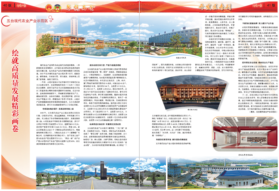 繪就高質(zhì)量發(fā)展精彩畫卷 現(xiàn)代農(nóng)業(yè)產(chǎn)業(yè)園作為農(nóng)業(yè)現(xiàn)代化的重要載體,一種新型的農(nóng)業(yè)發(fā)展模式,正在逐步成為推動農(nóng)業(yè)高質(zhì)量發(fā)展的關(guān)鍵力量,也為農(nóng)業(yè)產(chǎn)業(yè)的升級轉(zhuǎn)型提供了新的機(jī)遇。2025年五臺現(xiàn)代農(nóng)業(yè)產(chǎn)業(yè)示范區(qū)勇于擔(dān)當(dāng)、砥礪奮進(jìn),碩果盈枝。在招商引資、項目建設(shè)、營商環(huán)境上實現(xiàn)了新突破、展現(xiàn)了新作為。 一年來,示范區(qū)堅持以習(xí)近平新時代中國特色社會主義思想為指導(dǎo),全面貫徹落實黨的二十大和二十屆歷次會議精神,按照習(xí)近平總書記對國家級經(jīng)濟(jì)技術(shù)開發(fā)區(qū)工作重要指示精神為根本遵循和行動指南,在五臺縣委、縣政府的堅強(qiáng)領(lǐng)導(dǎo)下,因地制宜發(fā)展新質(zhì)生產(chǎn)力,聚焦招商引資、加快項目建設(shè)、優(yōu)化營商環(huán)境、抓牢安全生產(chǎn)等重點工作,圓滿完成了各項工作任務(wù),示范區(qū)產(chǎn)業(yè)轉(zhuǎn)型能級和經(jīng)濟(jì)發(fā)展質(zhì)效持續(xù)提升,為五臺縣經(jīng)濟(jì)高質(zhì)量發(fā)展、譜寫五臺實踐新篇章作出了示范區(qū)貢獻(xiàn)。 考核指標(biāo)穩(wěn)步提升發(fā)展態(tài)勢持續(xù)上揚(yáng) 2025年,五臺現(xiàn)代農(nóng)業(yè)產(chǎn)業(yè)示范區(qū)堅持以目標(biāo)為引領(lǐng),以結(jié)果為導(dǎo)向,強(qiáng)化監(jiān)測調(diào)度,牢牢把握工作主動權(quán),有力推動了各項考核指標(biāo)穩(wěn)步提升、發(fā)展態(tài)勢持續(xù)上揚(yáng)。6項發(fā)展水平考核任務(wù)全部圓滿完成,其中產(chǎn)業(yè)項目當(dāng)年預(yù)計完成投資4.7億元,超額完成0.2億元;固定資產(chǎn)投資當(dāng)年預(yù)計完成13.5億元,增速16%;新認(rèn)定省級龍頭企業(yè)2個(鴻耐農(nóng)業(yè)科技有限公司、鴻盛畜牧養(yǎng)殖有限公司),市級龍頭企業(yè)2個(福源醋廠有限公司、紅果蔬科技開發(fā)有限公司);農(nóng)產(chǎn)品加工業(yè)產(chǎn)值與農(nóng)業(yè)總產(chǎn)值比值預(yù)計為3.2:1;“兩品一標(biāo)”農(nóng)產(chǎn)品產(chǎn)量占示范區(qū)農(nóng)產(chǎn)品總產(chǎn)量的比重預(yù)計達(dá)到63%;農(nóng)業(yè)廢棄物資源化利用率預(yù)計達(dá)到92%。 激活動能招商引資產(chǎn)能升級提質(zhì)增效 五臺現(xiàn)代農(nóng)業(yè)產(chǎn)業(yè)示范區(qū)牢固樹立招商引資是推動示范區(qū)高質(zhì)量發(fā)展“第一要事”的理念,圍繞農(nóng)副食品加工、中藥材種植加工、文旅康養(yǎng)、生態(tài)養(yǎng)殖和現(xiàn)代物流等產(chǎn)業(yè)精準(zhǔn)招商,為示范區(qū)高質(zhì)量發(fā)展不斷增添活力。扎實開展招商活動。本年度先后赴北京、上海、杭州、廈門等地開展招商引資活動10余次,對接企業(yè)40余個,接待客商32次,簽約項目26個,總投資57.72億元,開工項目23個,總投資14.92億元;強(qiáng)化開放合作。示范區(qū)與中國開發(fā)區(qū)協(xié)會簽訂了戰(zhàn)略合作協(xié)議,著手共同打造特色產(chǎn)業(yè)園;招引項目提質(zhì)增效,隨著示范區(qū)區(qū)域知名度的穩(wěn)步提高,產(chǎn)業(yè)集群的發(fā)展壯大,簽約了一批投資體量大、科技含量高、帶動能力強(qiáng)、發(fā)展前景好的項目,構(gòu)筑了經(jīng)濟(jì)發(fā)展的新高地。簽約重大項目主要有總投資23.8億元的華通雕刻文化循環(huán)經(jīng)濟(jì)產(chǎn)業(yè)園建設(shè)項目、總投資24億元的山西五臺大數(shù)據(jù)智能電器制造產(chǎn)業(yè)園項目。開工建設(shè)項目25個,總投資16.9億元,主要有總投資4.5億元的欽泰錦坤大酒店項目、總投資2.26億元的景宜園小區(qū)建設(shè)項目、總投資1億元的東會民宿大院、總投資0.76億元的福地源生豬二期等項目。 縱深推進(jìn)機(jī)制改革積蓄園區(qū)發(fā)展動能 五臺現(xiàn)代農(nóng)業(yè)產(chǎn)業(yè)示范區(qū)不斷深化“三化三制”改革,全面推進(jìn)專業(yè)化、市場化、國際化運(yùn)行機(jī)制改革,完善了“管用分離”改革方案,構(gòu)建了權(quán)責(zé)清晰、分工合理、運(yùn)轉(zhuǎn)高效的現(xiàn)代化管理體制和市場化運(yùn)營機(jī)制。標(biāo)準(zhǔn)化廠房、核心道路、天然氣管線、有機(jī)生態(tài)示范園等項目的實施運(yùn)營將有力增強(qiáng)平臺公司自主發(fā)展的“造血功能”,為示范區(qū)高質(zhì)量發(fā)展積蓄動能。全力推進(jìn)“三項改革”。推行承諾制審批,豆村核心區(qū)區(qū)域評價9項已全部完成;東雷片區(qū)豆東線沿線3.6平方公里的區(qū)域評價7項已經(jīng)完成,洪水評價、水土保持文本編制已經(jīng)完成。全年推進(jìn)承諾制試點項目2個。深化“標(biāo)準(zhǔn)地”出讓,示范區(qū)成立以來一共出讓“標(biāo)準(zhǔn)地”16宗358.27畝,成交總價款4915萬元。目前儲備標(biāo)準(zhǔn)地2宗,面積31.46畝。完善全代辦服務(wù),確定領(lǐng)辦代辦人員13名,領(lǐng)辦代辦審批服務(wù)事項110余項,代辦率100%。進(jìn)一步完善了審批職能,基本實現(xiàn)了“區(qū)內(nèi)事、區(qū)內(nèi)辦”目標(biāo),逐步爭取實現(xiàn)“全程網(wǎng)辦”。 持續(xù)創(chuàng)優(yōu)營商環(huán)境提升服務(wù)保障效能