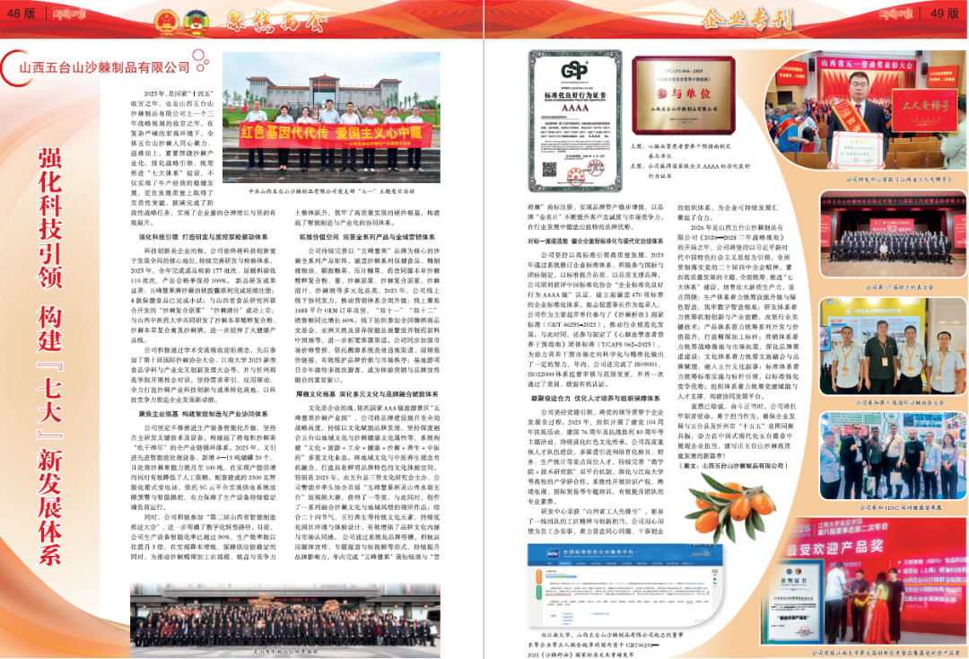 2025年,是國家“十四五”收官之年,也是山西五臺山沙棘制品有限公司上一個三年戰(zhàn)略規(guī)劃的收官之年。在復(fù)雜嚴(yán)峻的宏觀環(huán)境下,全體五臺山沙棘人同心聚力、迎難而上,緊緊圍繞沙棘產(chǎn)業(yè)化,強(qiáng)化戰(zhàn)略引領(lǐng),統(tǒng)籌推進(jìn)“七大體系”建設(shè),不僅實現(xiàn)了生產(chǎn)經(jīng)營的穩(wěn)健發(fā)展,更在發(fā)展質(zhì)量上取得了實質(zhì)性突破,圓滿完成了階段性戰(zhàn)略任務(wù),實現(xiàn)了企業(yè)量的合理增長與質(zhì)的有效提升。